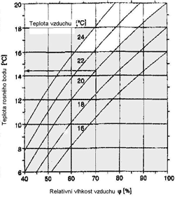 Teplota rosného bodu se určí z okamžité teploty vzduchu v místnosti a z příslušné relativní vlhkosti (Tabulka 1)
